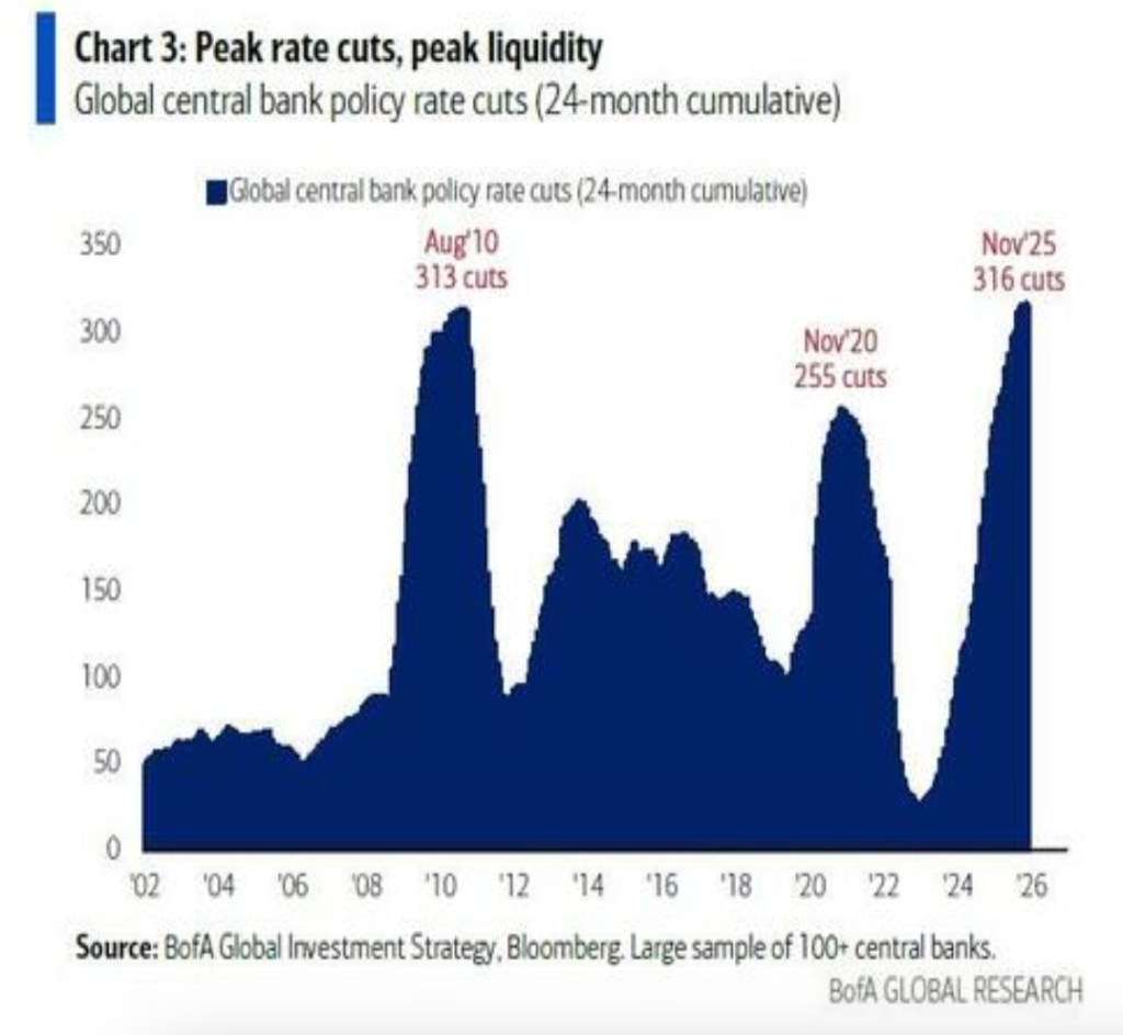 Hartnett expects that the current weakness in U.S. bank stocks is signaling a pattern similar to December 2018, and the ongoing decline in liquidity-sensitive sectors could force the Federal Reserve to pivot towards an easing policy. Looking back at 2025, a cumulative total of 316 rate cuts by global central banks had created a liquidity boom, directly driving three major market phenomena: AI investment frenzy, sharp volatility in Japanese stocks, and cryptocurrency speculation.